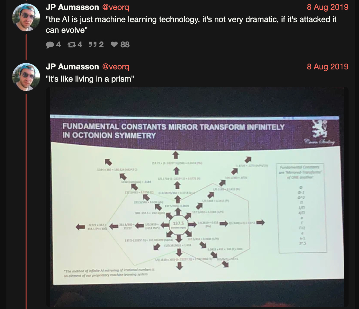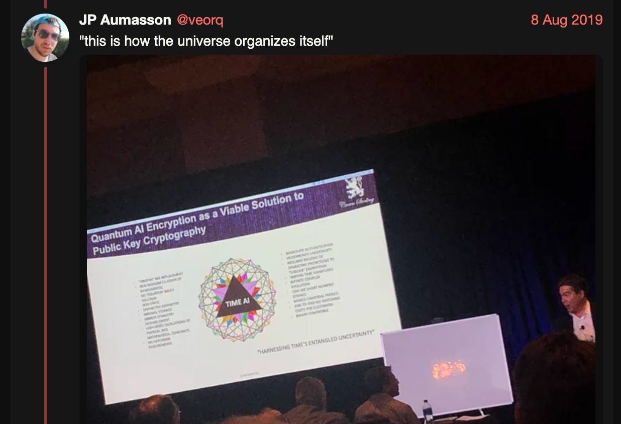 Time fucking AI. The mother of all crypto snake-oil. AI scams before it was cool. New age mysticism. Music theory. Infinity. A charismatic leader—“A modernized polymathic life propelled by intention.” I had the chance to witness it live at Black Hat 2019, sitting next to fellow cryptography expert Dan Guido. It was glorious.